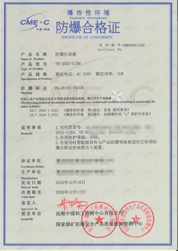 答:必须重新申请整机认证。防爆合格证是针对最终成品颁发的。即使所有部件都有证,但整机的组装工艺、内部布线、整体结构、接地连续性、标志等构成了一个新的防爆系统,必须经过整体评估和测试,以确保其安全性。 - 问:防爆合格证有效期多久?到期怎么办?
